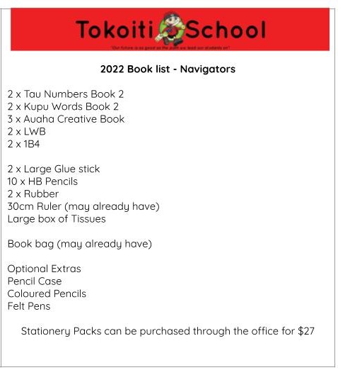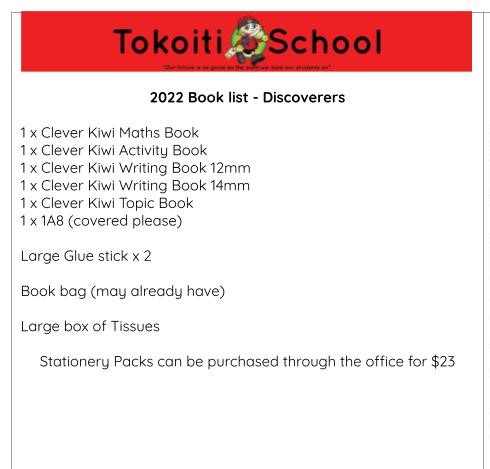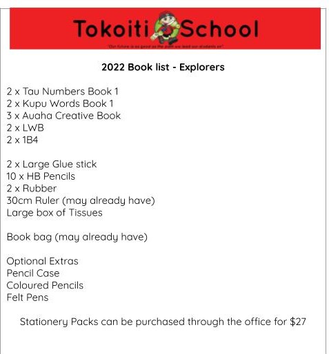 Here are the Stationery Lists for next year, stationery can also be purchased through the office, the order form is attached. Our lists can also be found at https://schoolpacks.co.nz/ https://docs.google.com/forms/d/1kw6l_Mmh9mKvEHj2tvvgttp57HzIIOlACs1TiFmNap0/edit